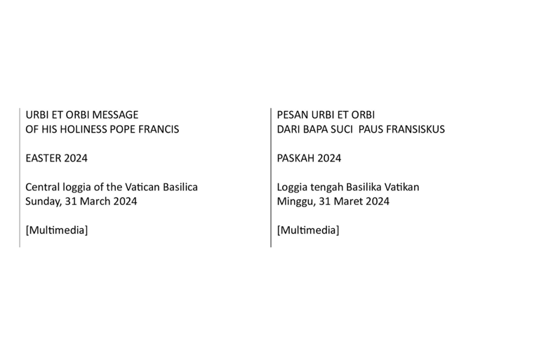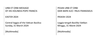 URBI ET ORBI MESSAGE OF HIS HOLINESS POPE FRANCIS, EASTER 2024