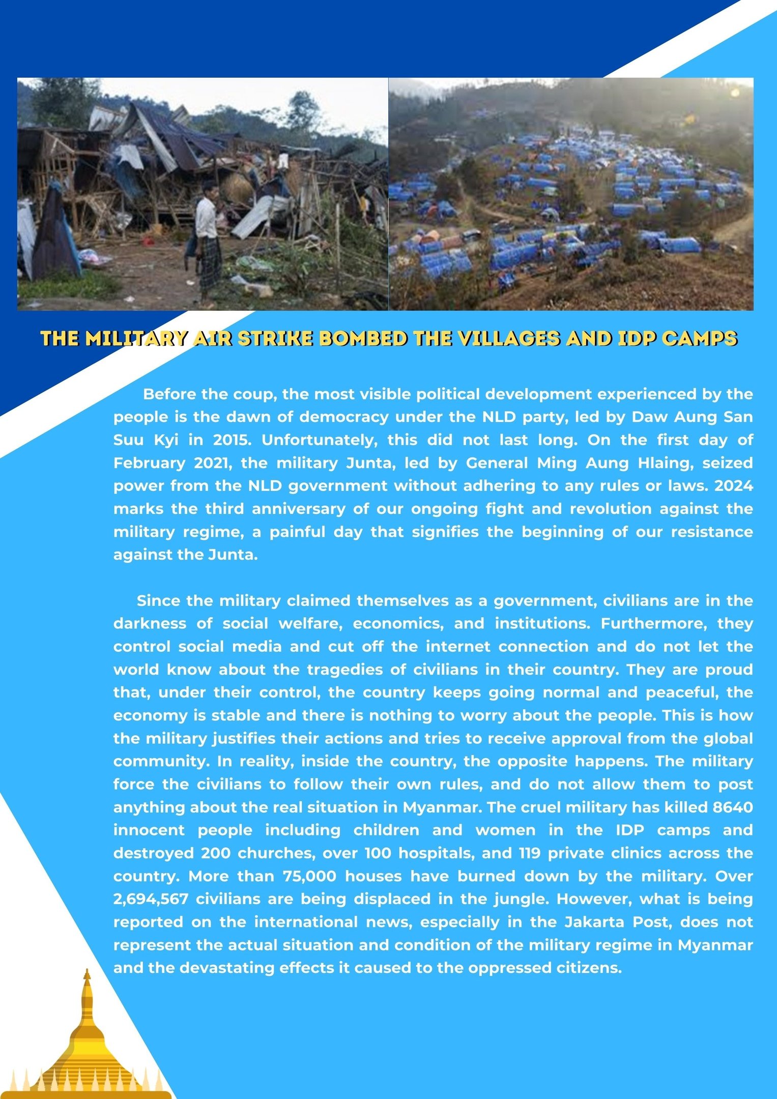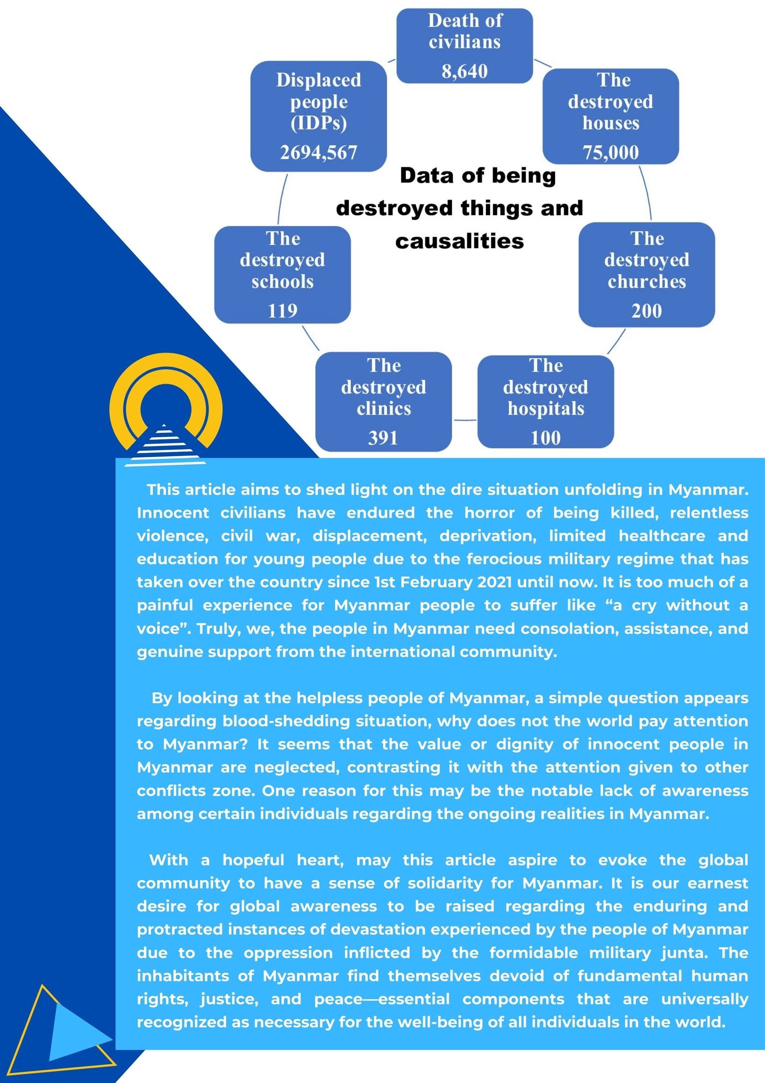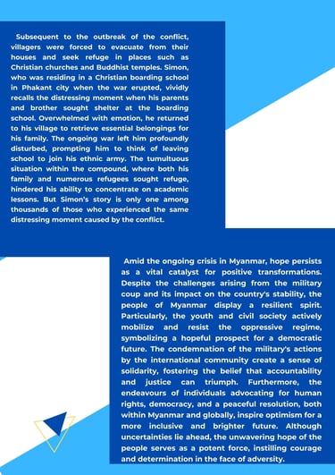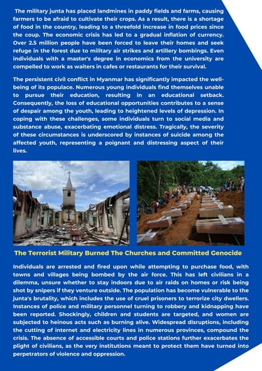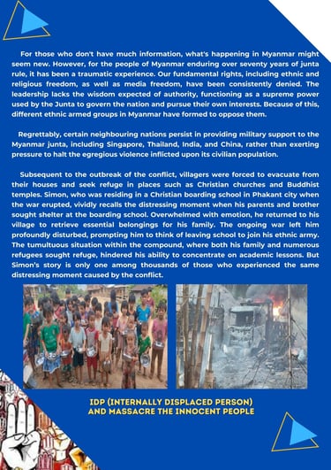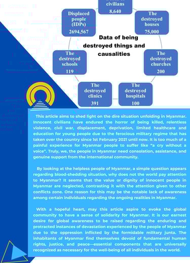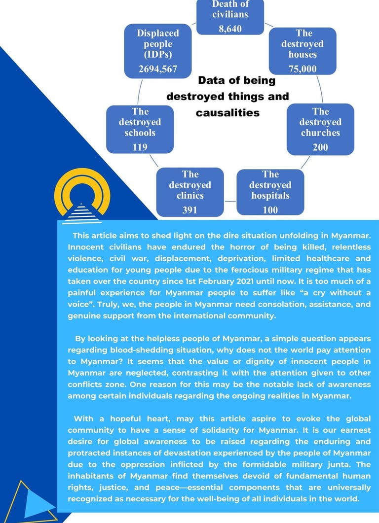 This article aims to shed light on the dire situation unfolding in Myanmar. Innocent civilians have endured the horror of being killed, relentless violence, civil war, displacement, deprivation, limited healthcare and education for young people due to the ferocious military regime that has taken over the country since 1st February 2021 until now.